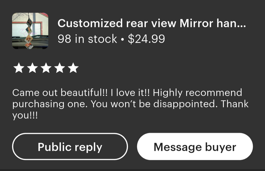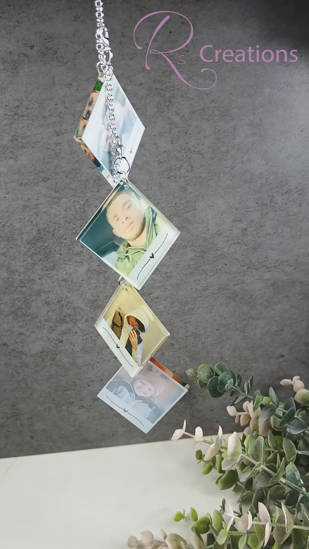 Customized with your own photos. This comes with 4 pieces of non scratch clear acrylic! (Not plastic like most) Each with a picture you want on it. You can purchase additional photo acrylic pieces at any time to add onto it! They attach with a lobster claw so you can position them how you want to.