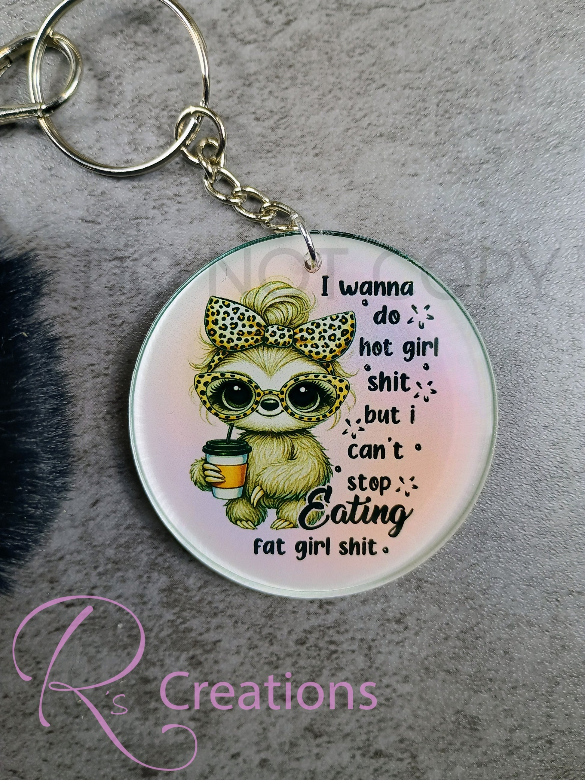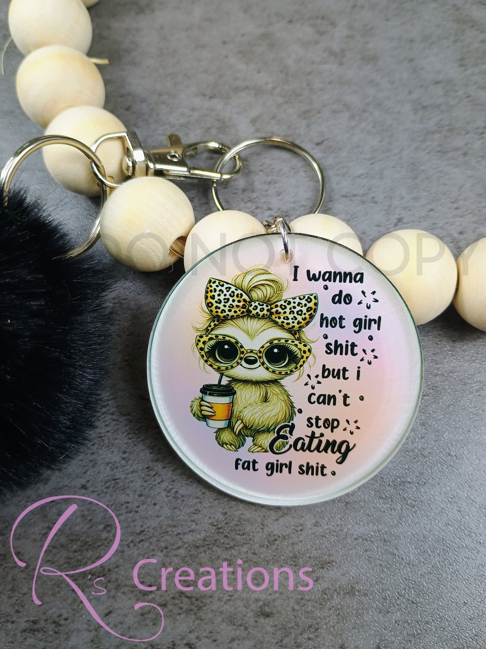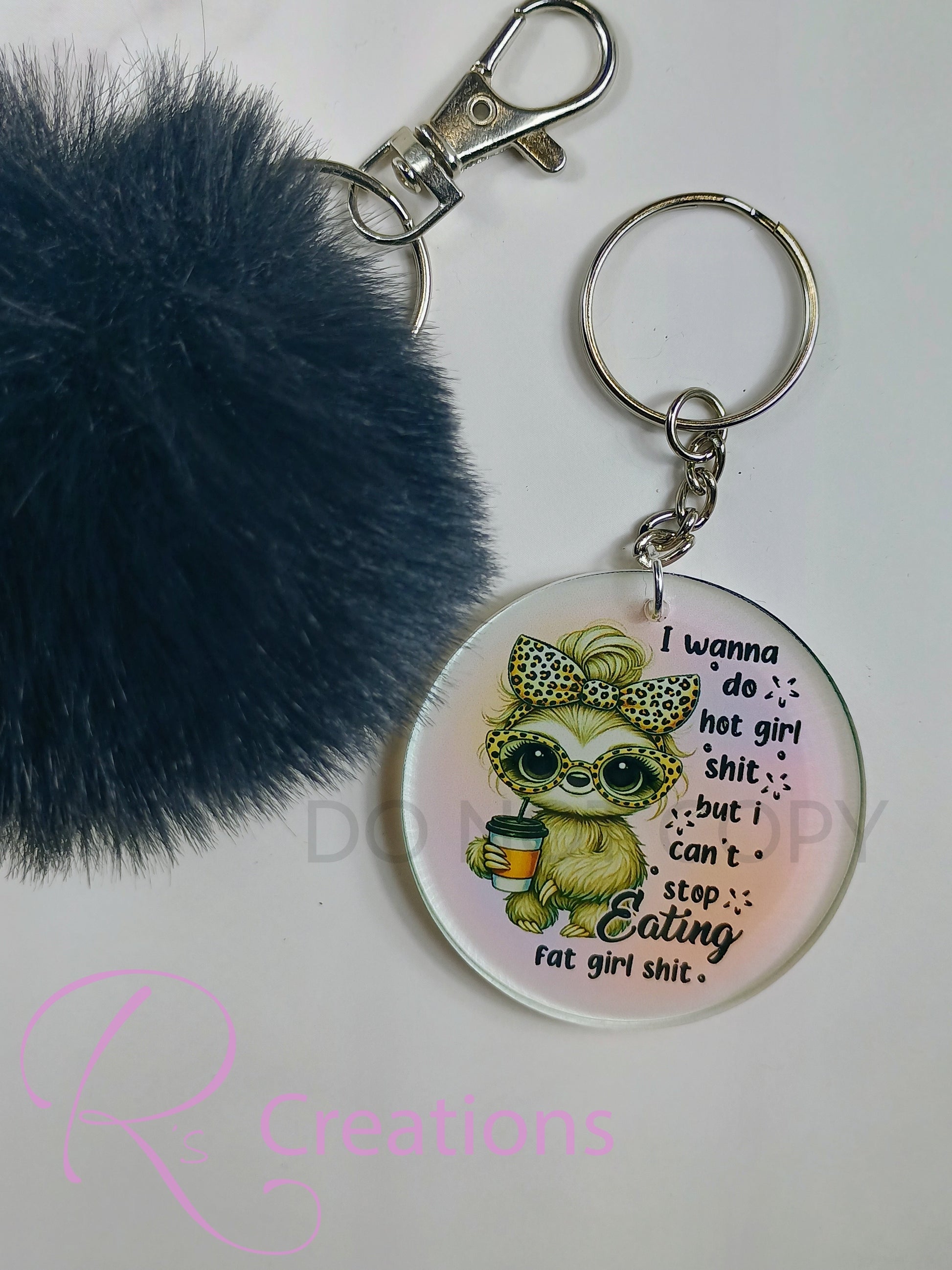 2" round acrylic on a key ring and a black pom pom on a ring with a clip