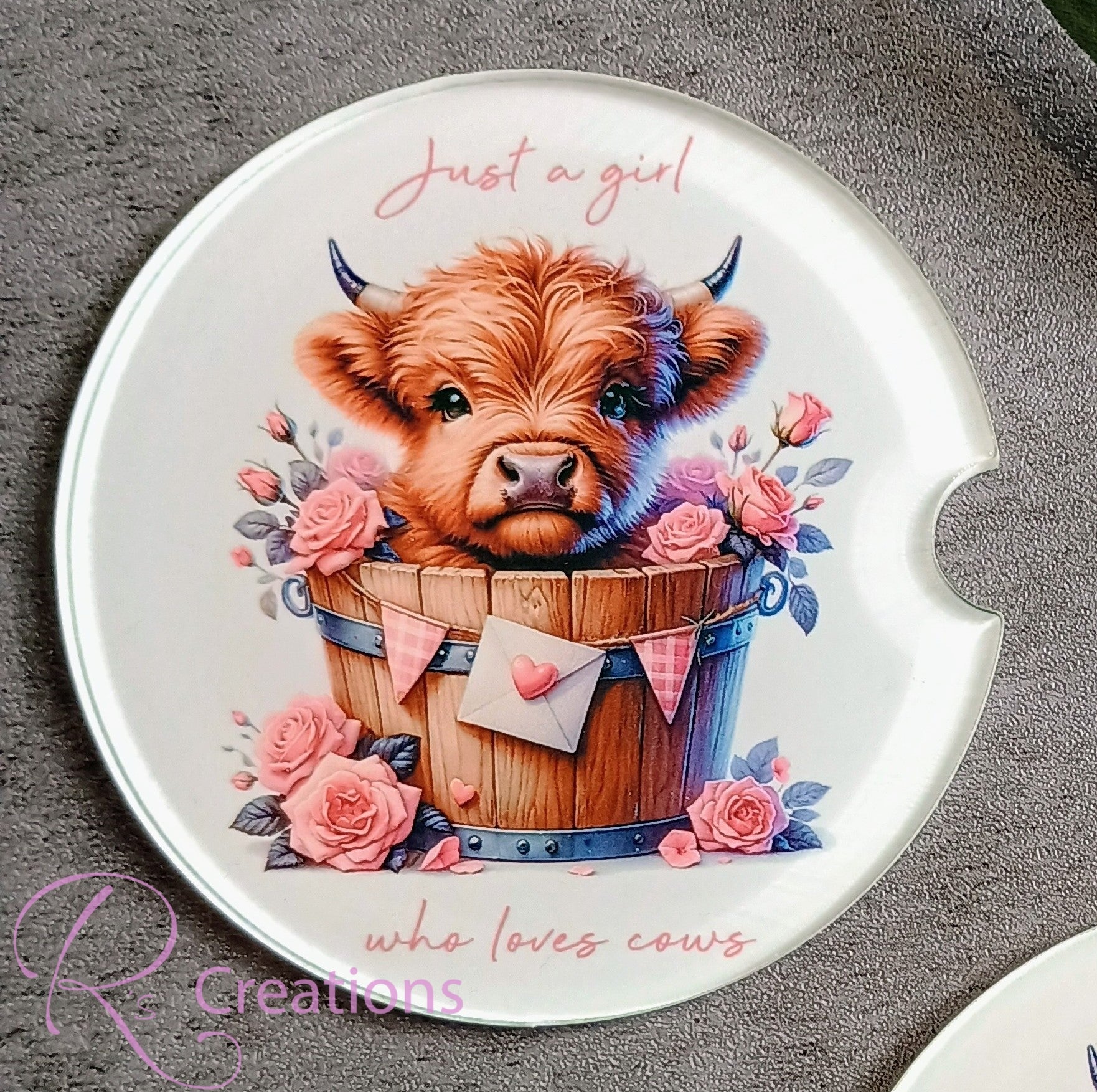 Highland cow car coaster set, acrylic, just a girl who loves cows