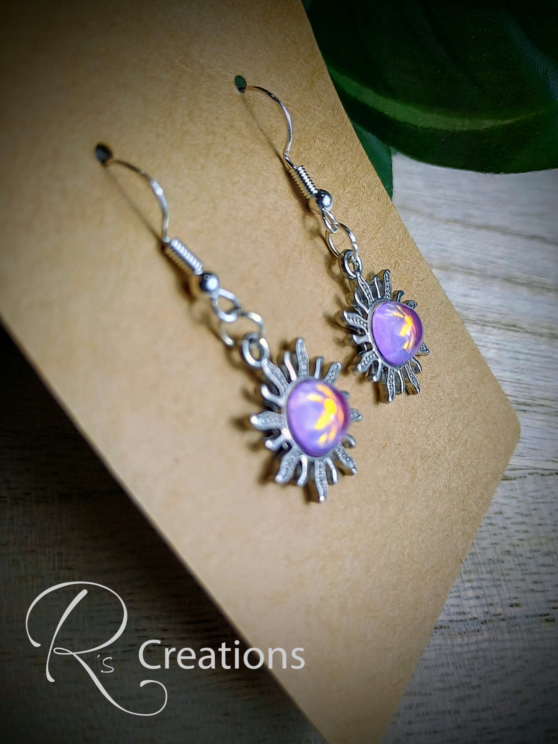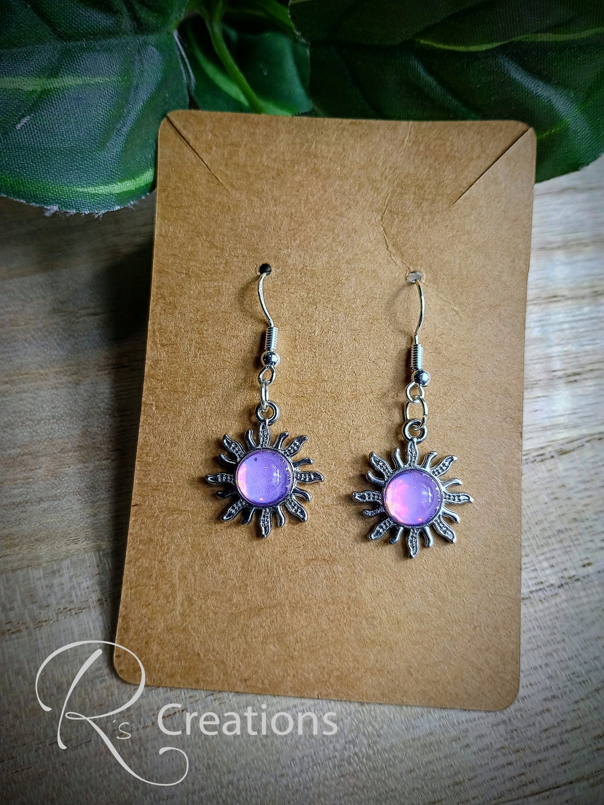 Pink and purple sun shaped earrings, dangle