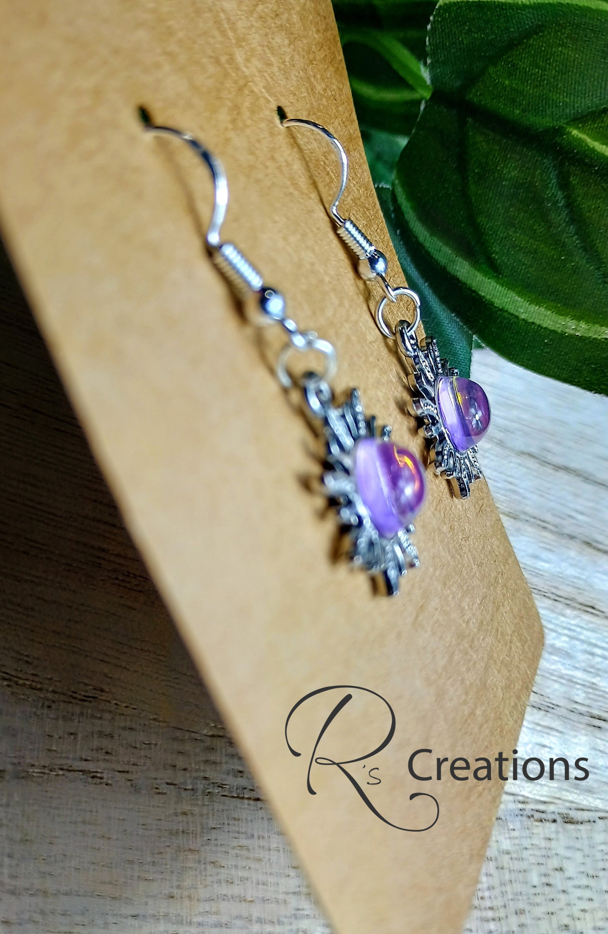 Super cute dangle earrings. Middle is a purple/pink stone set in a moon shape pendant.